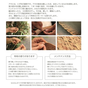 葉を取り、茎の部分を乾燥させ、丁寧に編み込んだものが、アタ製品となります。アタ製品は、”100年の耐久性を持つ”と言われているくらい丈夫なので、永くご使用いただけます。